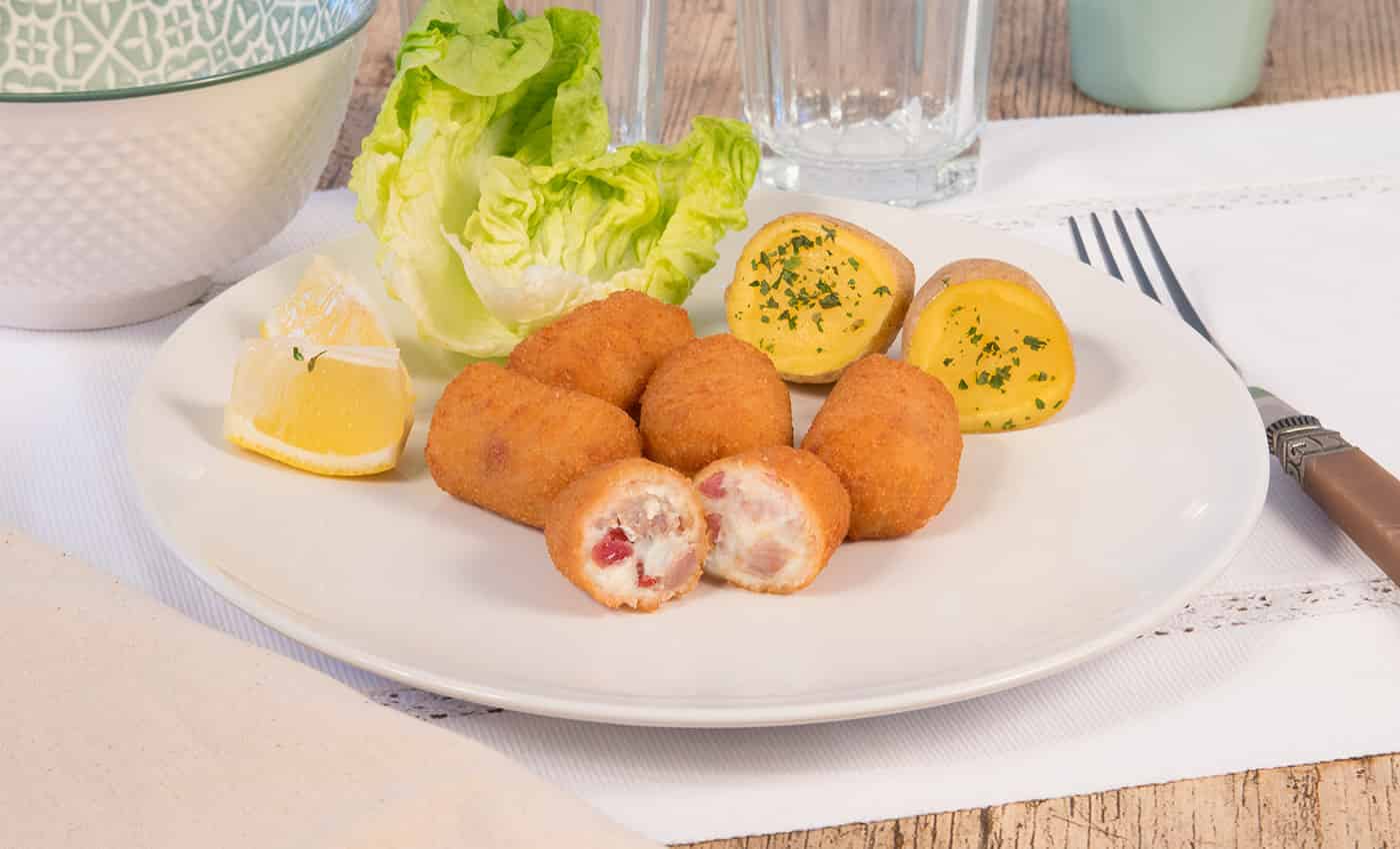 Crujientes croquetas elaboradas con trocitos de pollo, jamón y una cremosa bechamel.