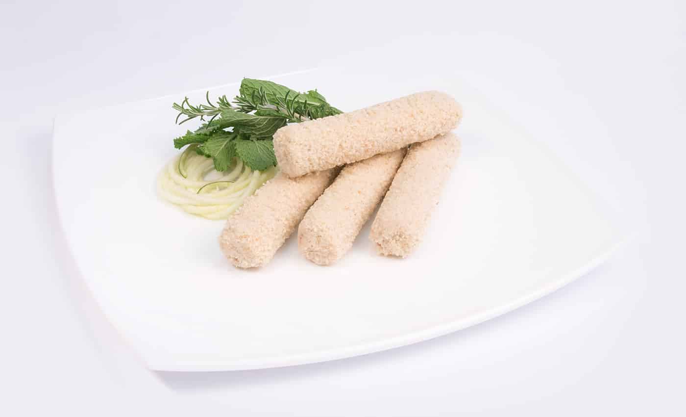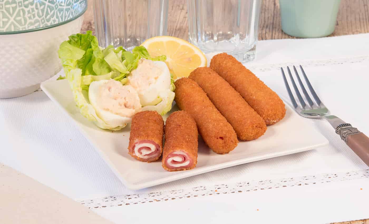 Finas láminas de jamón de pavo y queso enrolladas y rebozadas con pan.