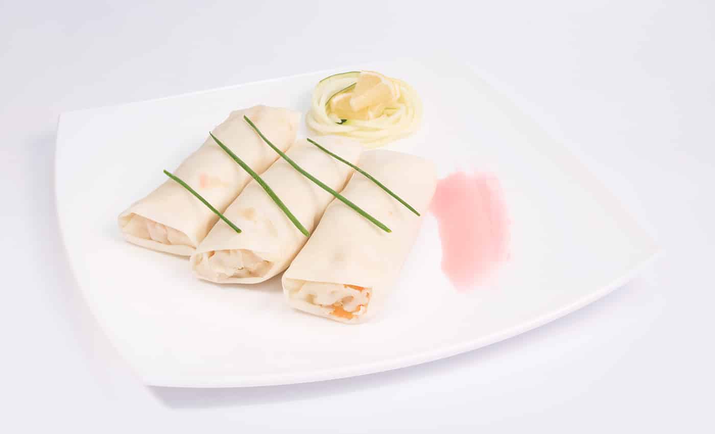 Deliciosas verduras cortadas en juliana y mezcladas con trocitos de pollo, todo envuelto en una ligera oblea.